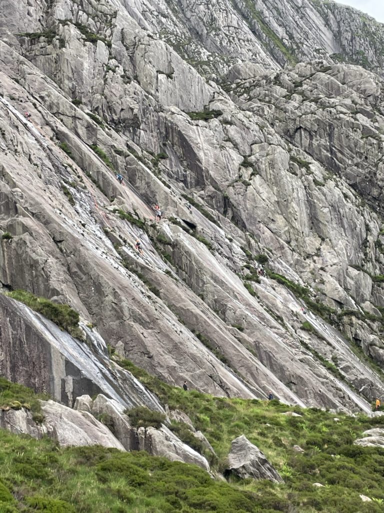 About a third of the way around we spotted these people attempting to scale the rock slabs. Considering how crumbly the rock is and how fast the weather changes, this is quite a feat. It also helps explain why Snowdonia was a training ground for Everest climbers George Mallory and later Sir Edmund Hillary.