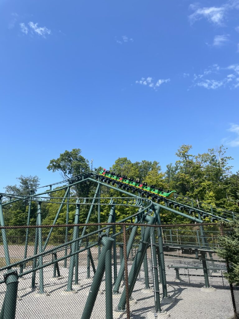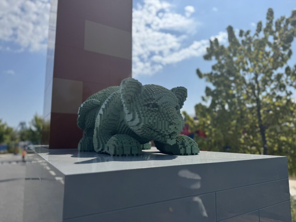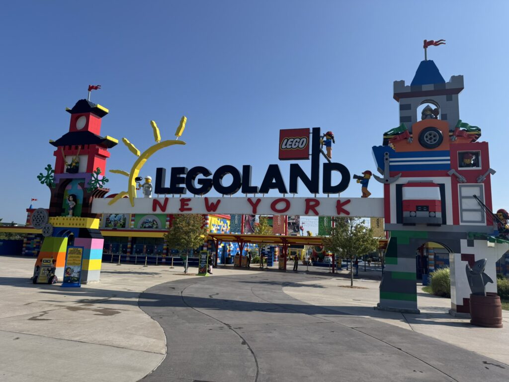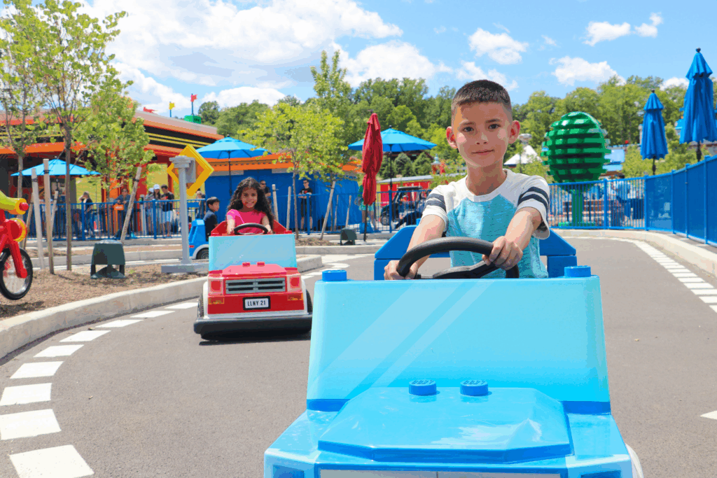 This sadly is only available to kids aged 6 to 13, so adults were forced to sit this one out. Thankfully we found a small patch of shade in a somewhat breezy spot, so we weren’t entirely cooked. You can tell that Legoland NY only opened in 2021 – the trees are still quite small. It will be nice once they grow, but that’s going to be a lengthy process.
