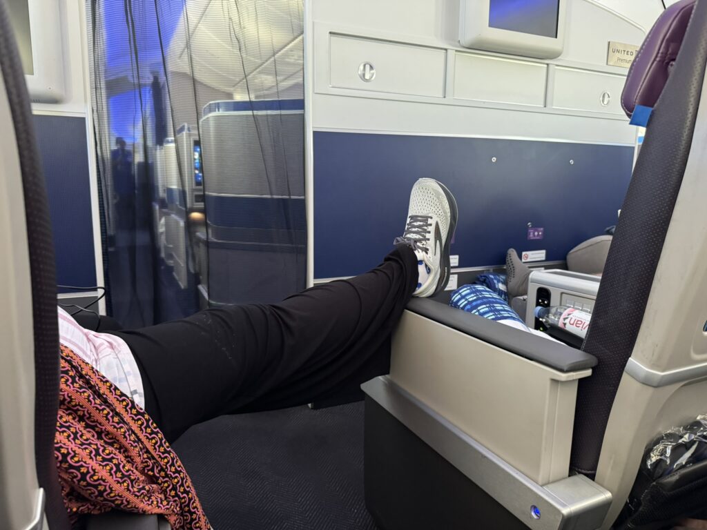 But we eventually boarded, and we were relieved to find that there was still plenty of overhead bin space remaining. So much, in fact, that I was able to also store my complimentary pillow, blanket, toiletry kit, and headphones up there along with my backpack. I’m not sure I’ve had more footspace except in lie-flat seats.