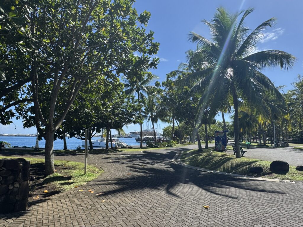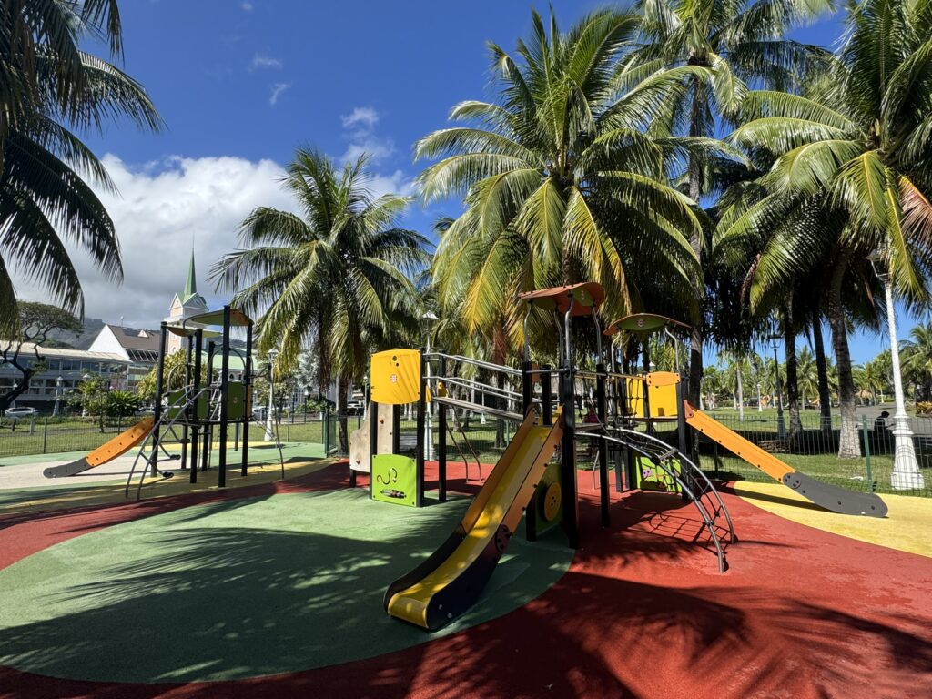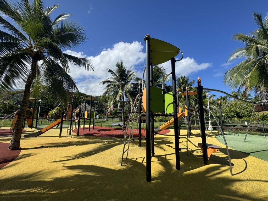 Our ferry to Moorea didn’t leave til just after noon, so we wandered down to Pā’ōfa’i Gardens. Here the kids found not one but two playgrounds: