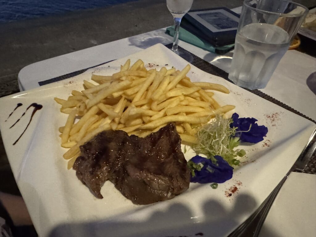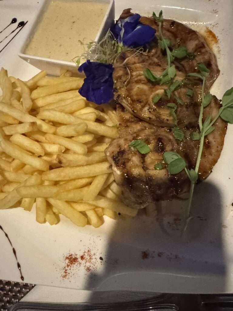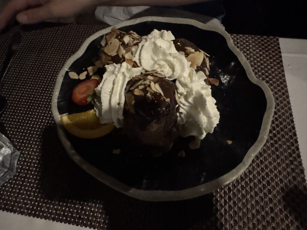 It was an absolute mountain of food. I stole a bit of the profiteroles, but otherwise the adults were content with our mains. We’ll be in the land of infinite dessert soon enough!