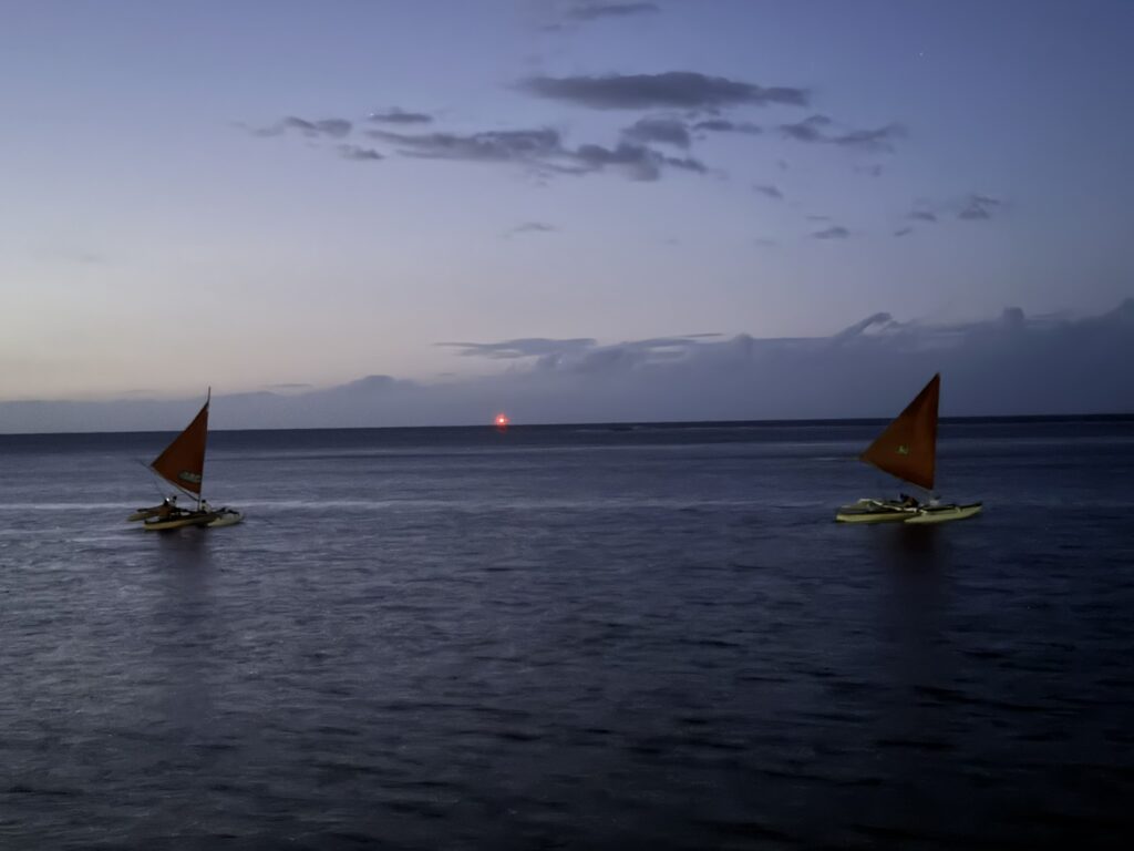 And then off for dinner. We had a lovely table with a view of the bay and the canoes: