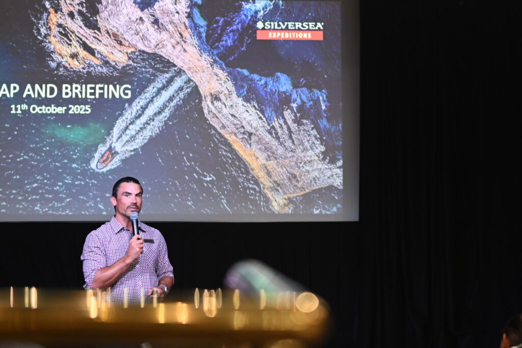 The morning is chock-full of briefings. We started with the usual zodiac briefing, which is old hat for most of those present – but not all, as there are some who seemed dismayed to learn that the zodiacs would be the only way off the boat for most of the trip.