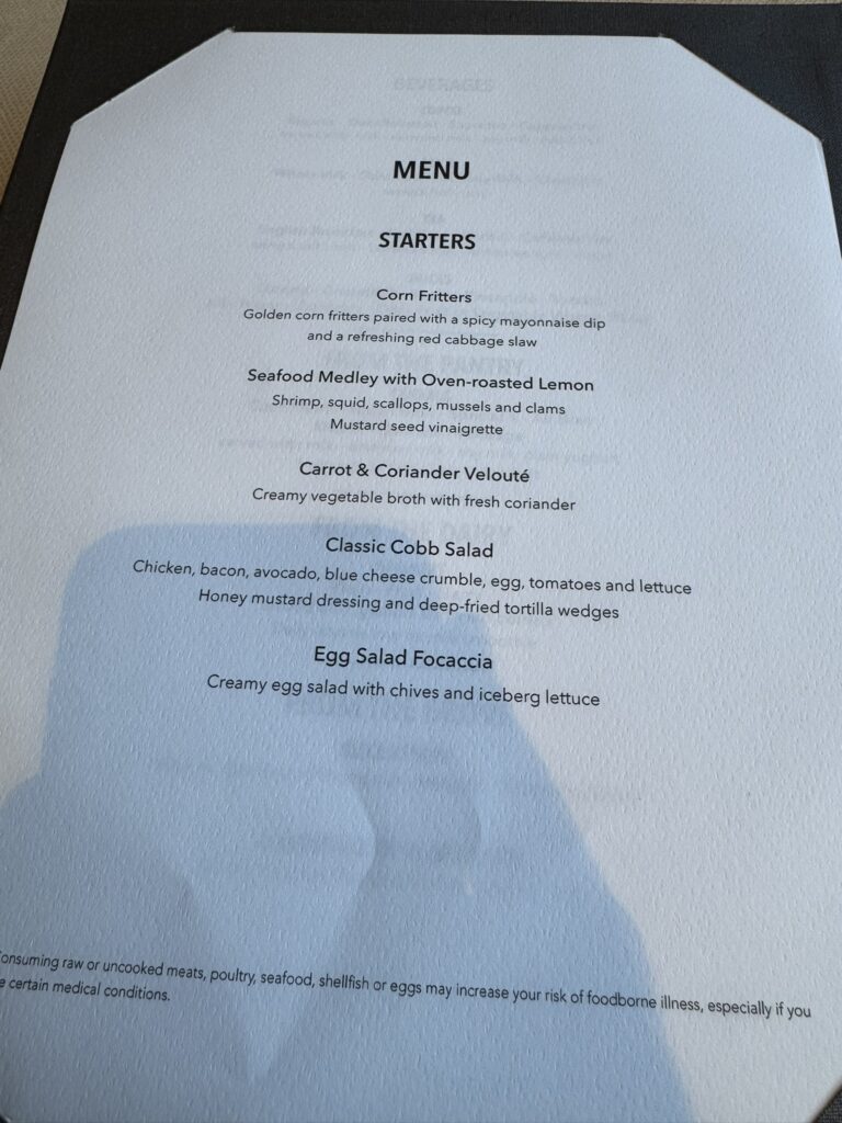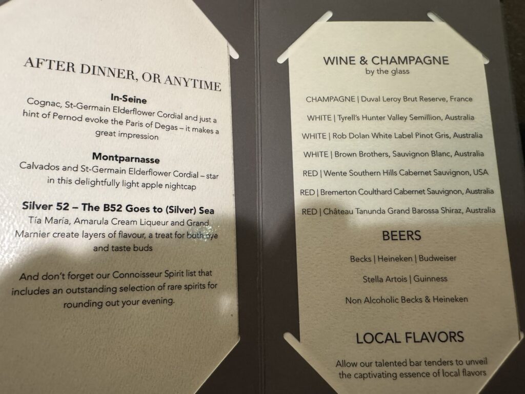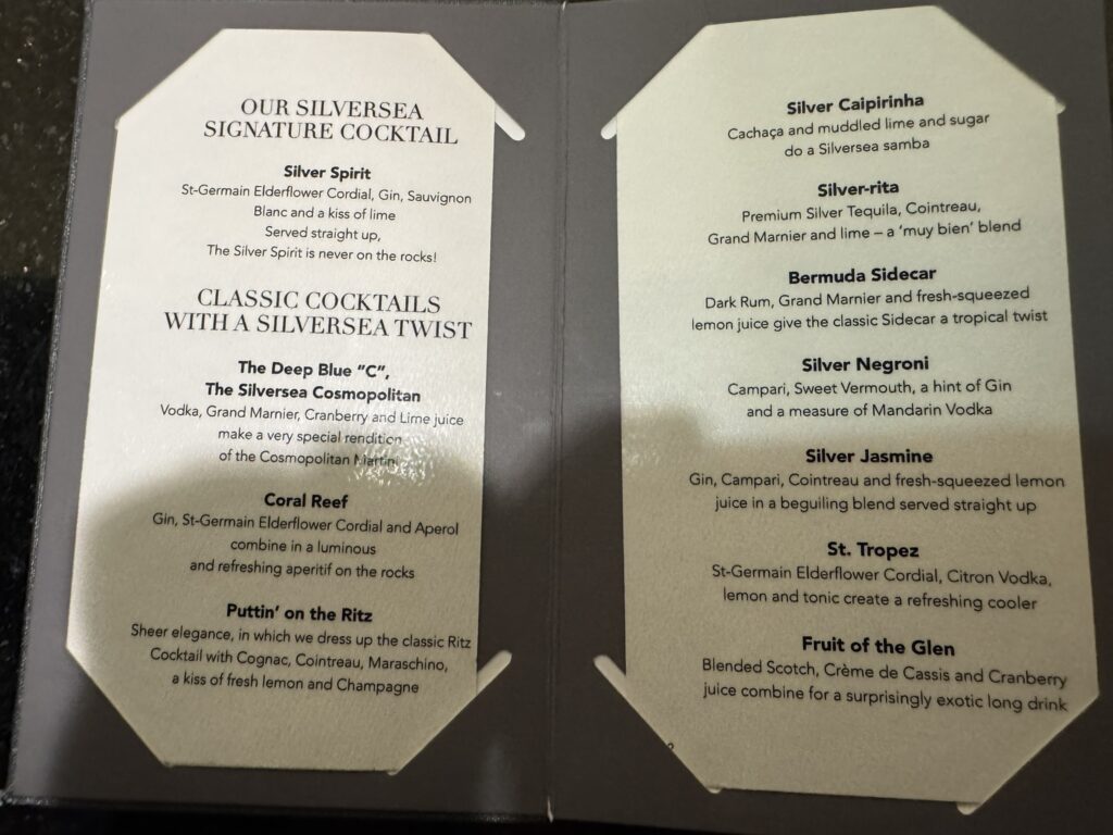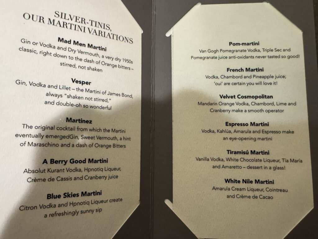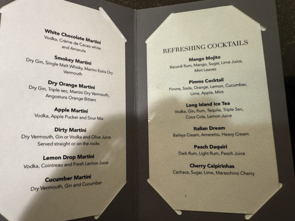With a sea day coming up, we managed a nighttime cocktail before collapsing – which gave us a chance to photograph the cocktail menu for the first time: