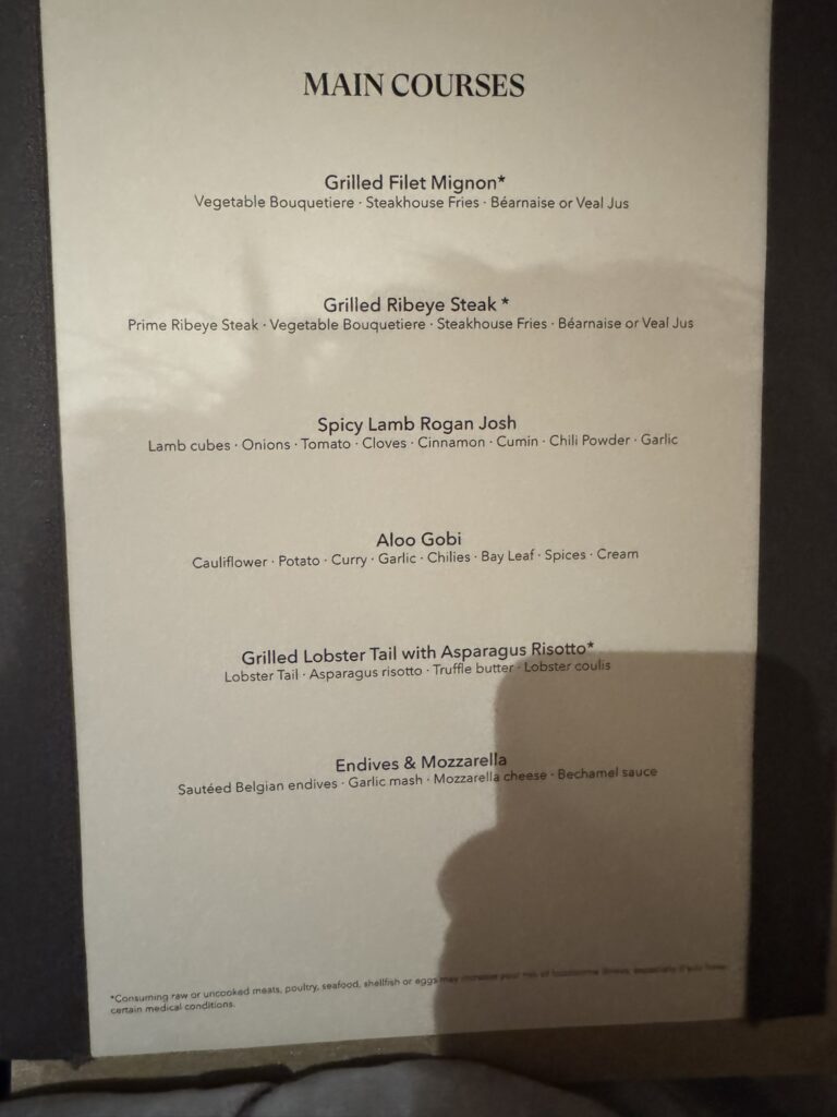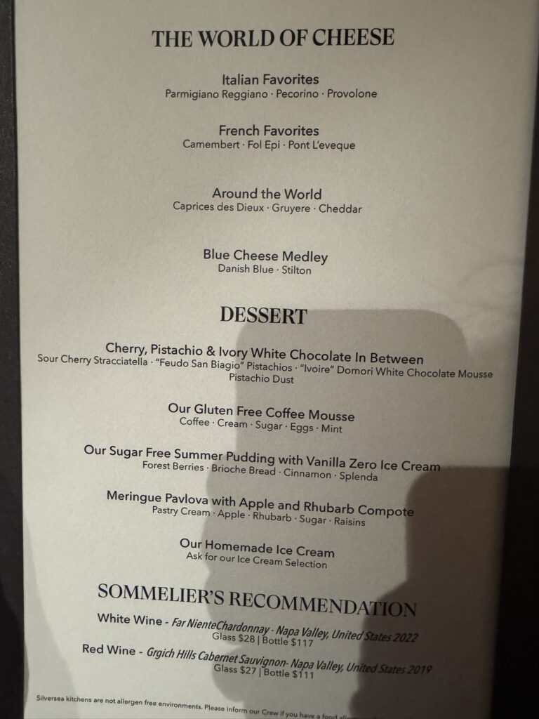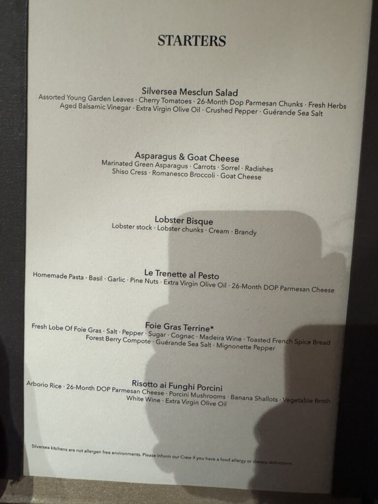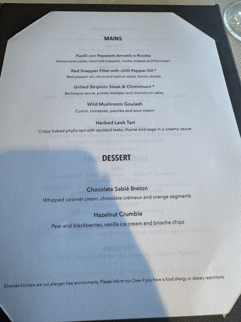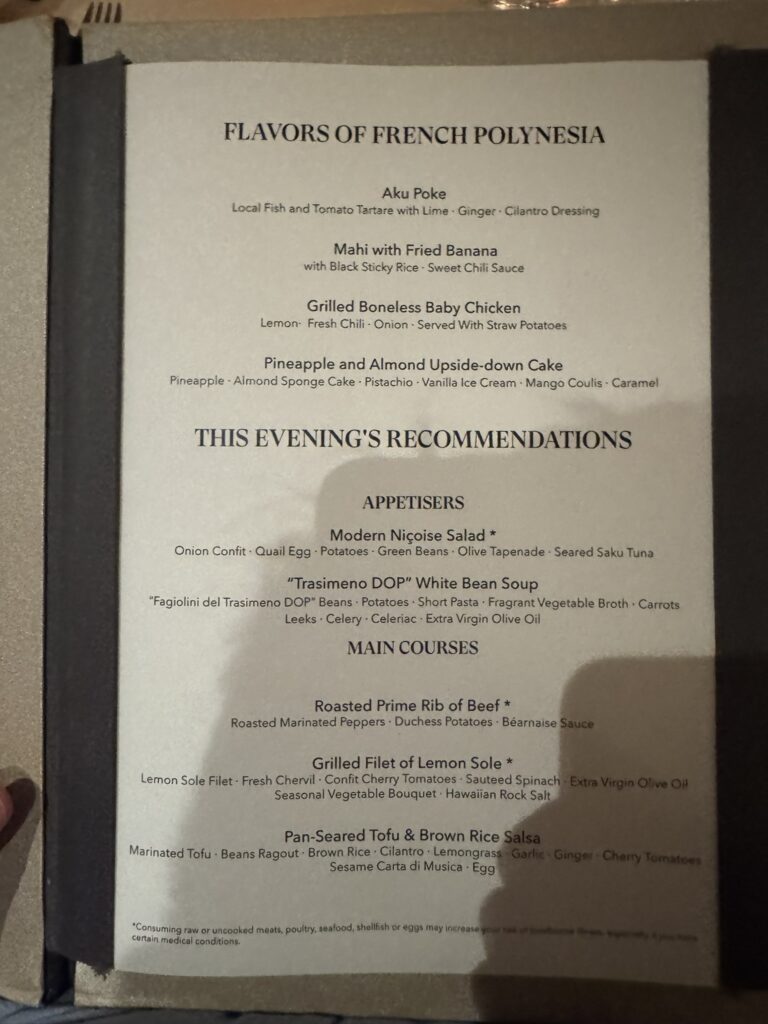 Off to dinner at the Restaurant. Tonight’s menu: