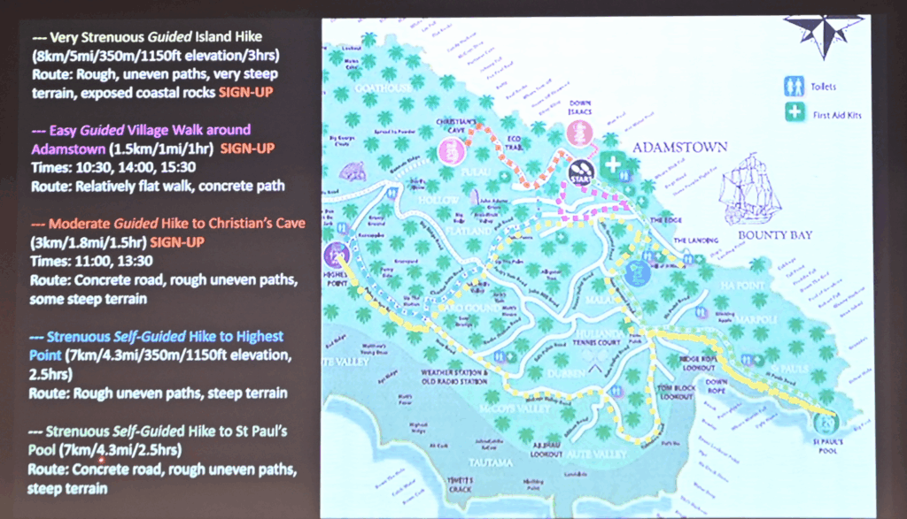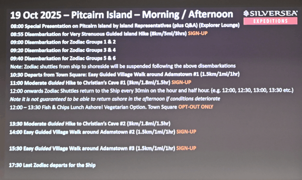 This is remarkable, as I’ve heard that many stops at Pitcairn are a half day at most – though a full day on island seems almost too much to hope for. We’re particularly interested in the strenuous hike to the viewpoint, visiting Christian’s Cave, and the trip out to St Paul’s Pool. So basically, all of it.