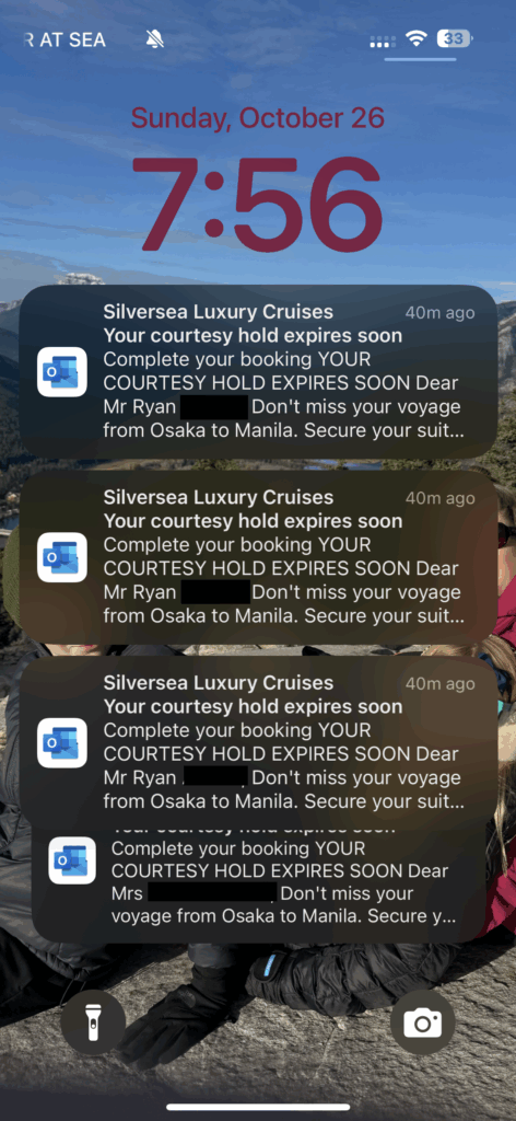 Back off to our room where I was bombarded with reminders regarding the soon-expiring holds for our umpteen million accidentally-reserved staterooms: