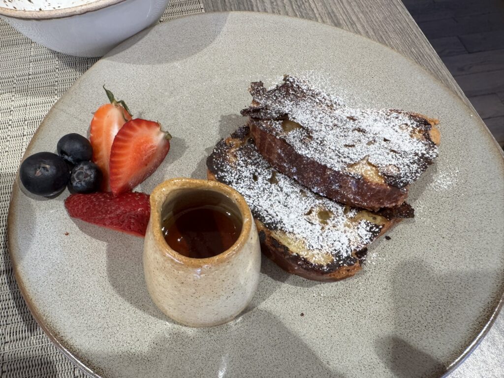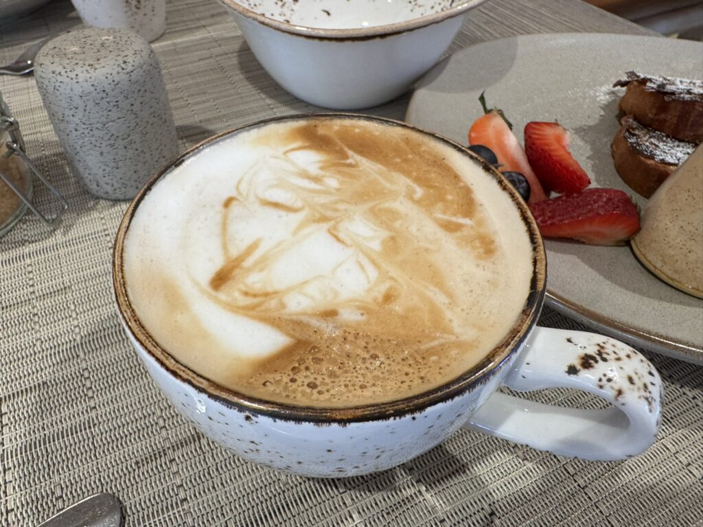 My wife and daughter were off on a horseback ride this morning, so it’s just my son and I for breakfast today. The hot breakfast menu runs from 7:30 to 9:30 am, but there’s a buffet breakfast put on for those with earlier excursions – this includes scrambled and hard boiled eggs, sausage or bacon, toast, pastries, fruit, sandwich supplies, and more.
