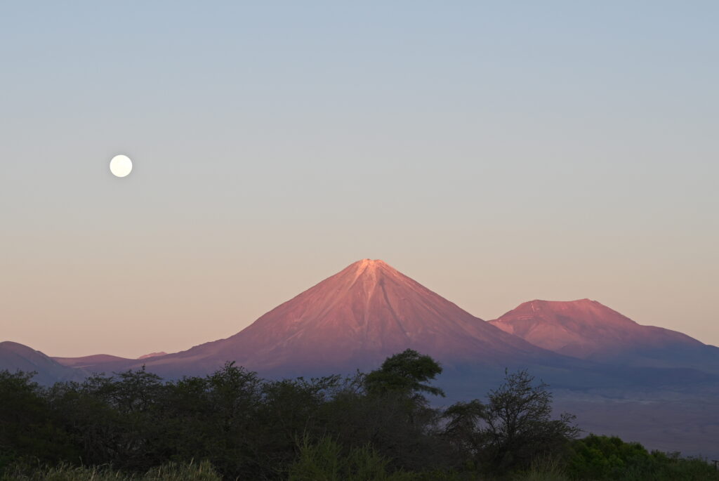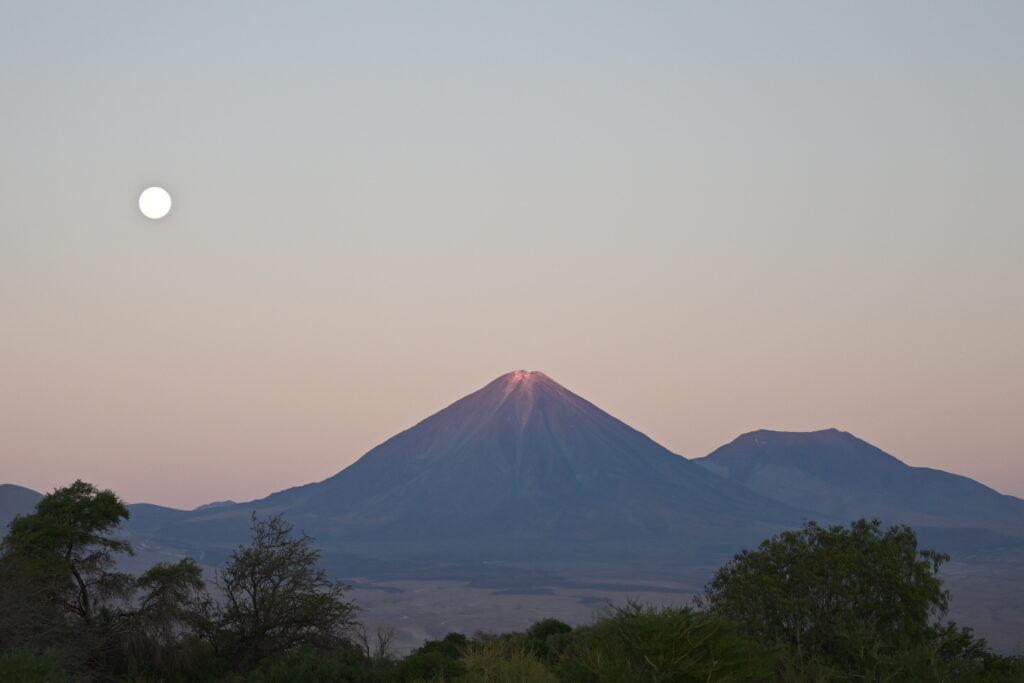 In the span of moments, the landscape shifts – soon only the very tip of the volcano is lit by the sun’s final rays: