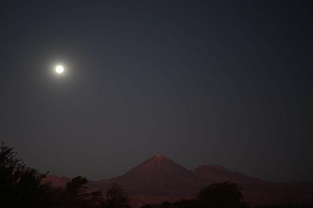We spare one more look back on the volcano, now lit by the glow of an all-but-full moon: