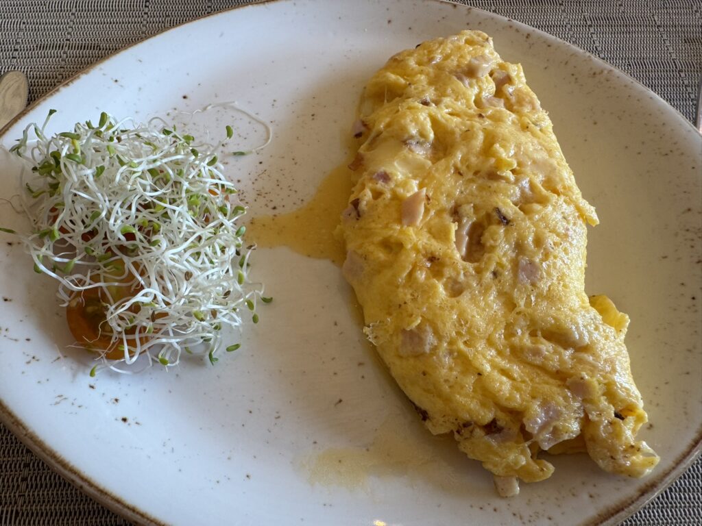 Off to the lodge for breakfast – where we had our usual prompt service and delicious food. Just to switch things up, I ordered a ham-and-cheese omelette: