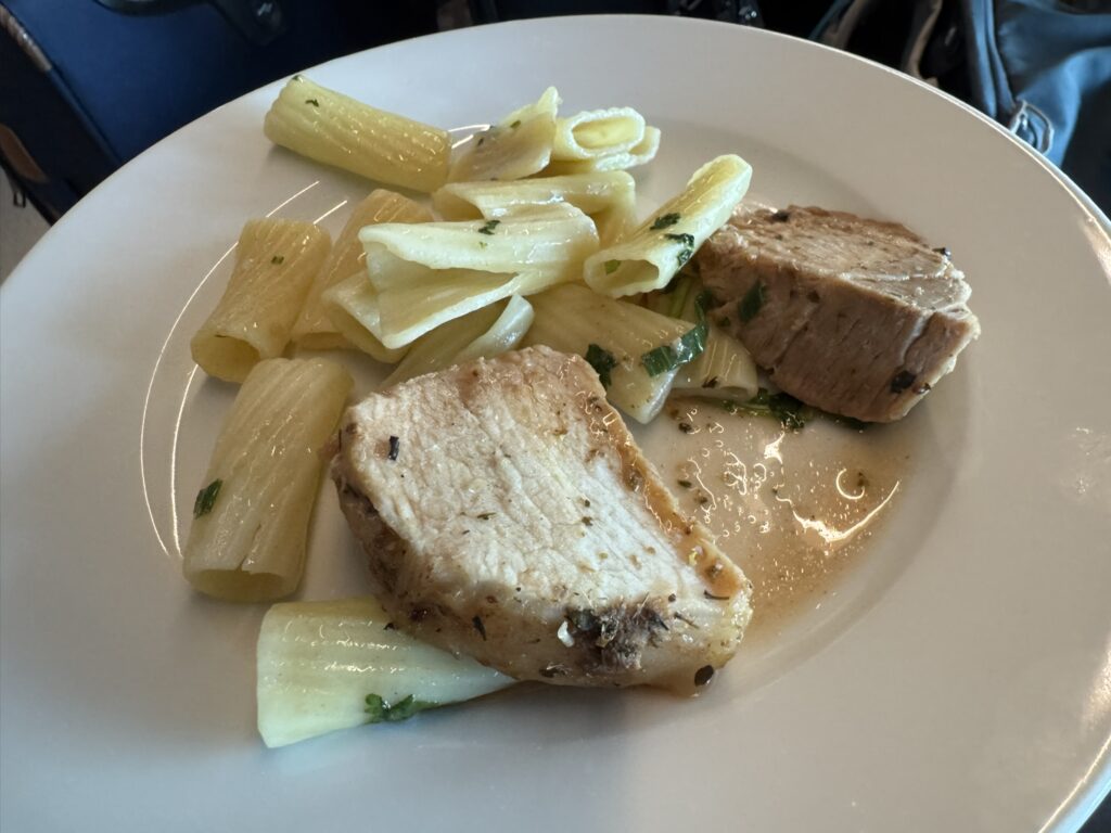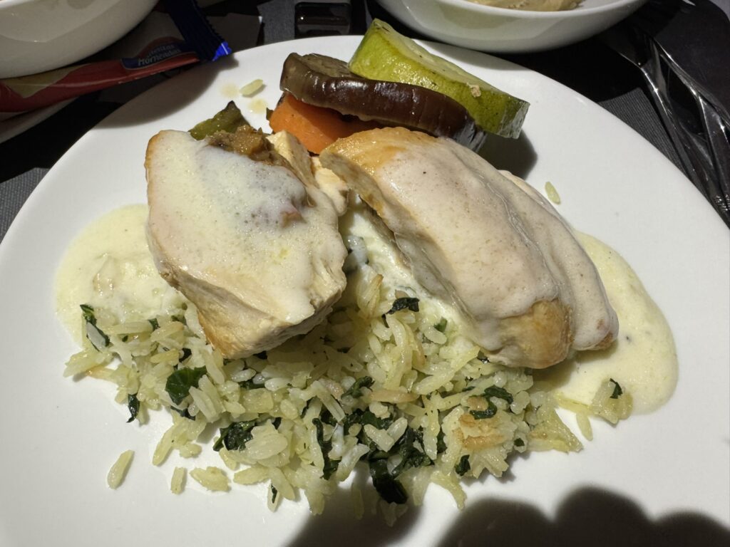 It takes a long time to board a Dreamliner so the flight attendants make the rounds with champagne and take everyone’s meal order. I’m close to the back – they are out of the beef tenderloin by the time they reach me, so I opt for the chicken instead.
