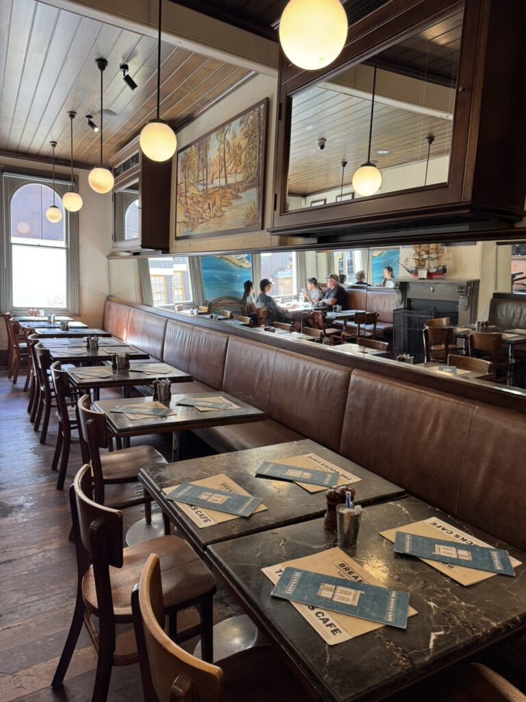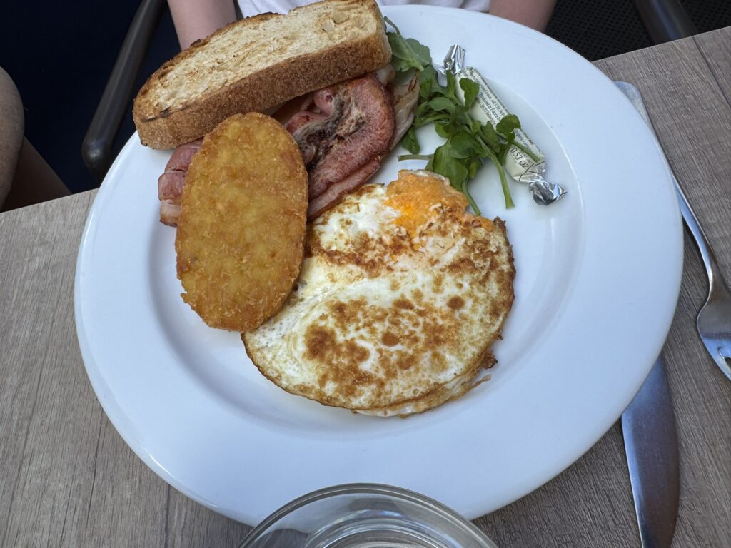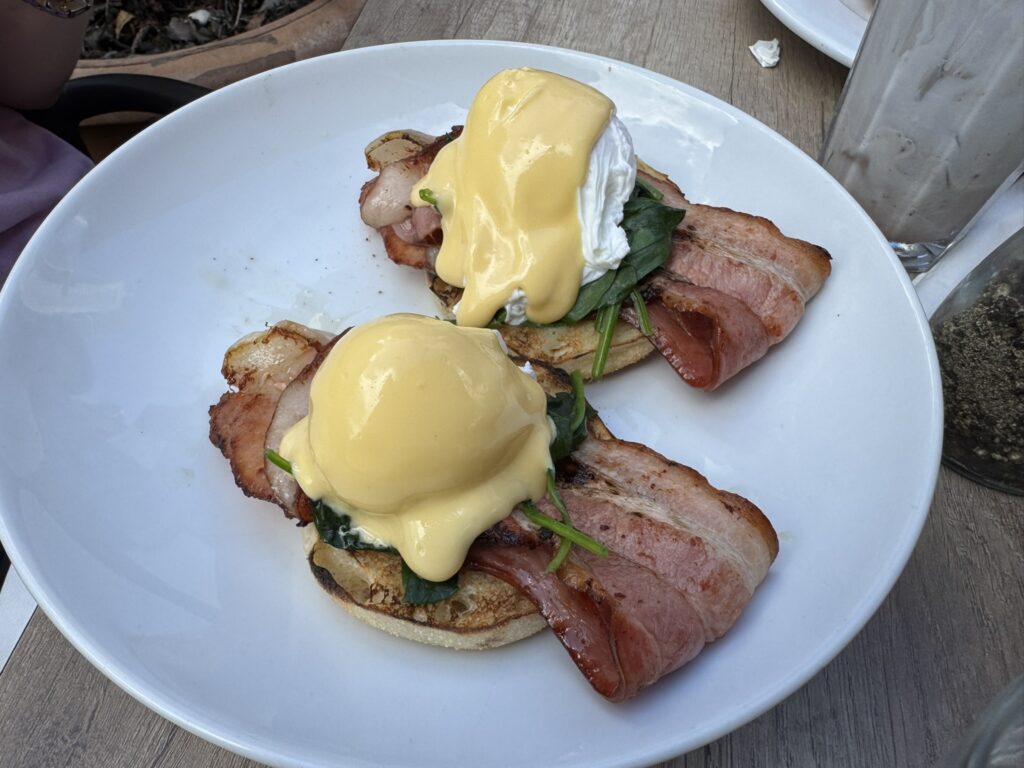 It’s a fantastic little restaurant with a streetside patio – but reservations are highly recommended. We chose ours for 9:45 am and scarcely make it. My wife and I both have the bacon benedict: