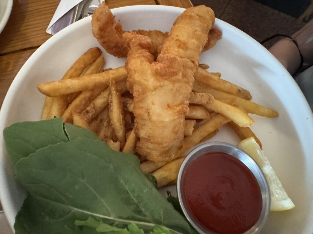 Service is surprisingly brisk. Soon my daughter receives her fish and chips: