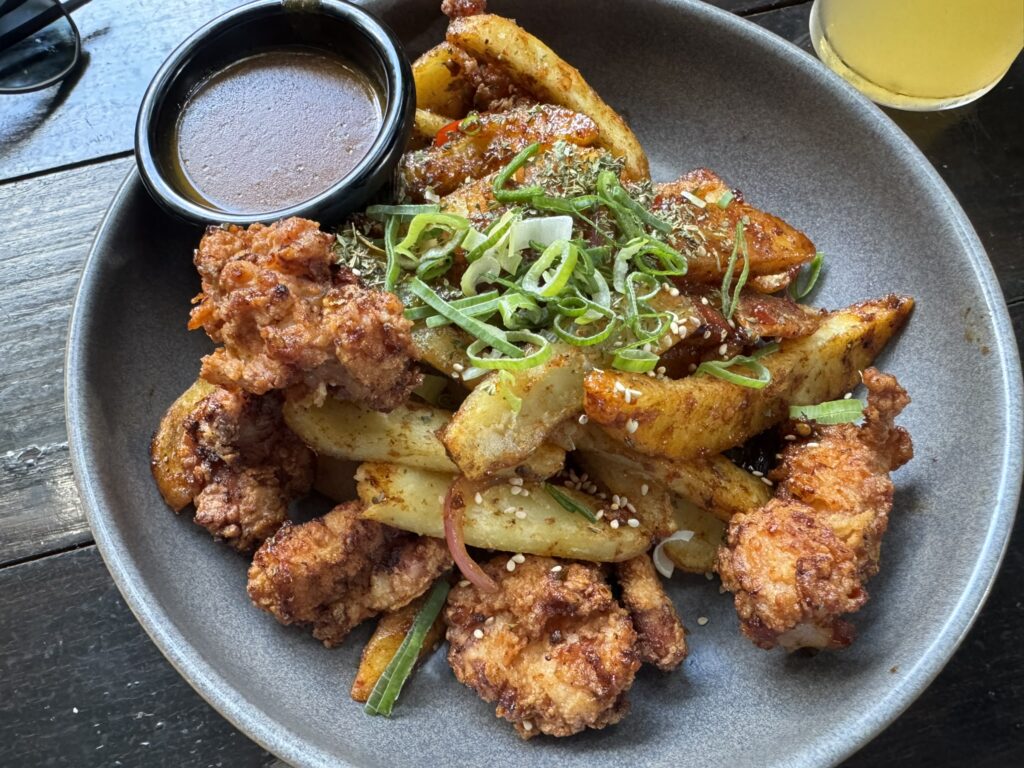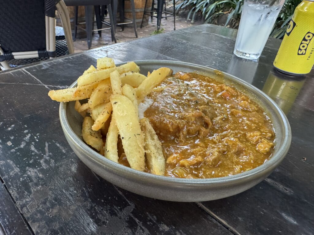 While I have a “spice bag” – crispy chicken, chips and curry sauce on the side: