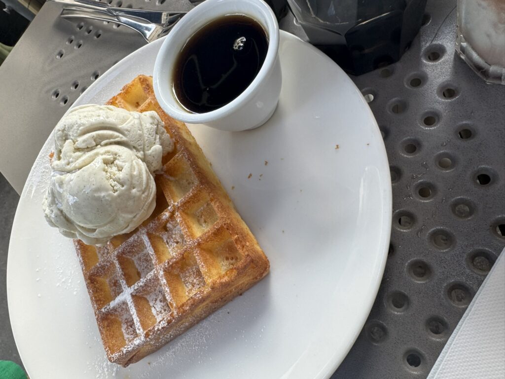 And the kids each have a waffle with ice cream and maple syrup.