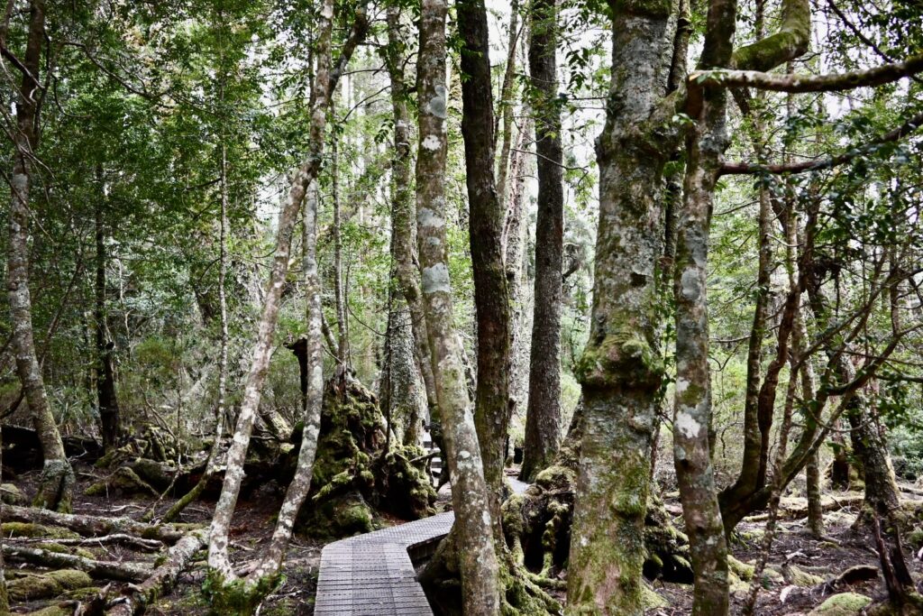 Excellent timing on our part – we manage to grab a shuttle just as it’s leaving. It’s standing room only, but that’s fine for us. We get off at Ronny Creek, along with a cohort of hikers who are attempting the Overland Trek from Ronny Creek to Narcissus – a 65 km route that takes six days to cover.