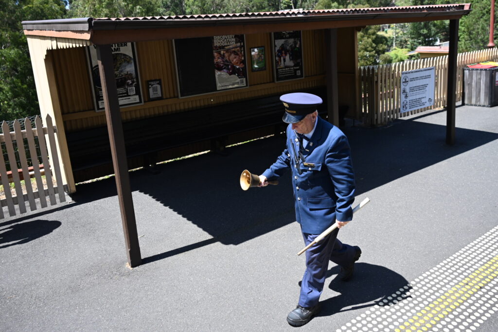 The station master rings the bell: