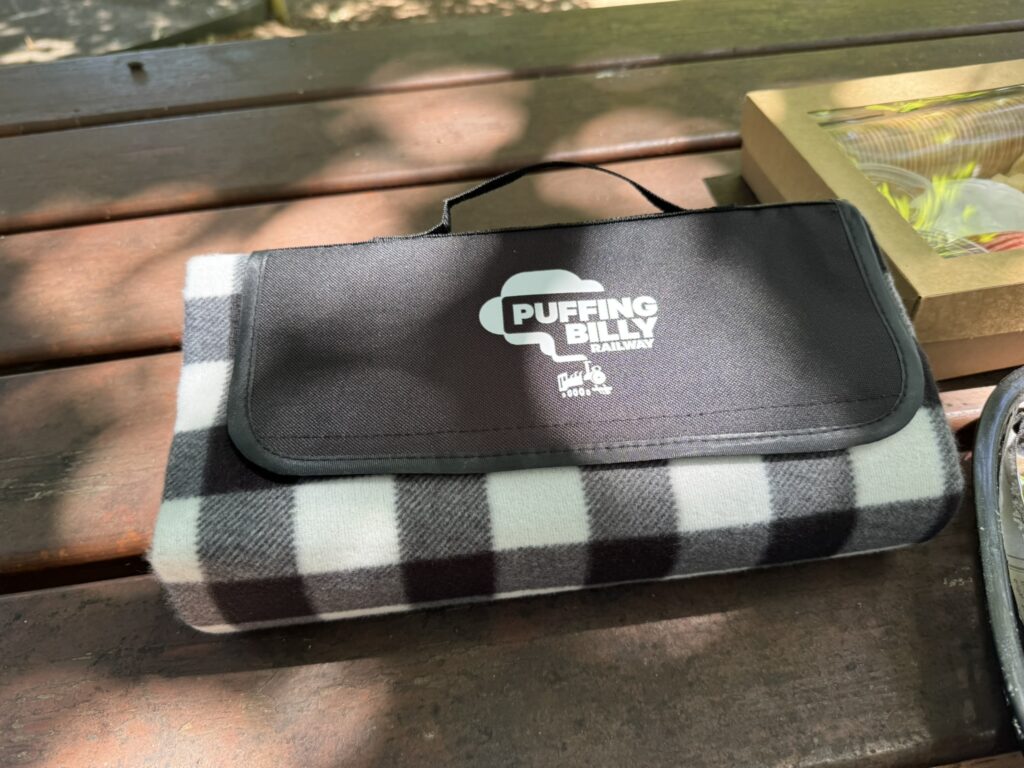 We arrive at Puffing Billy roughly 1 hour and 15 minutes in advance of our train. Though they’re still checking in guests for an earlier departure, we’re nevertheless able to check in for our own train – picking up the train tickets as well as tickets for our grazing box for two, picnic blanket, and a further two orders of scones. We’ll claim all the food at the Visitor’s Centre at the Lakeside stop upon our arrival.