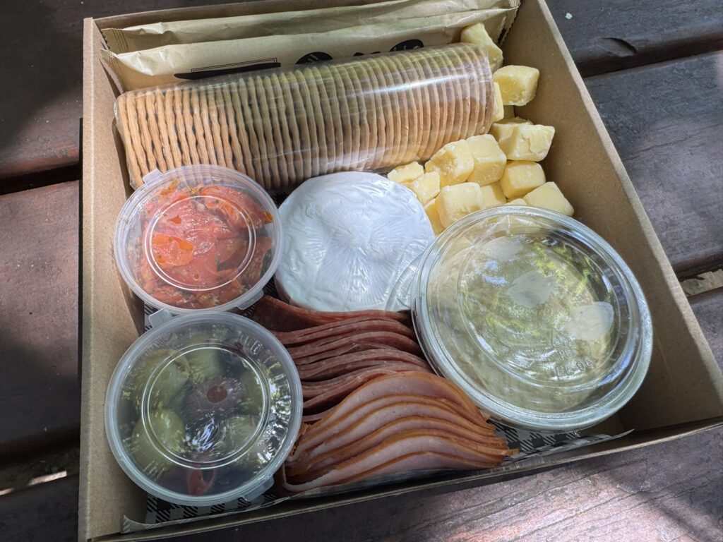 We find a nice shady spot by the lake and tuck in. The graze box for two is particularly massive: