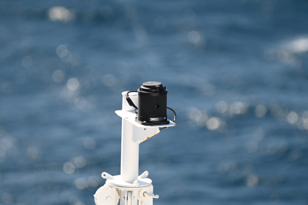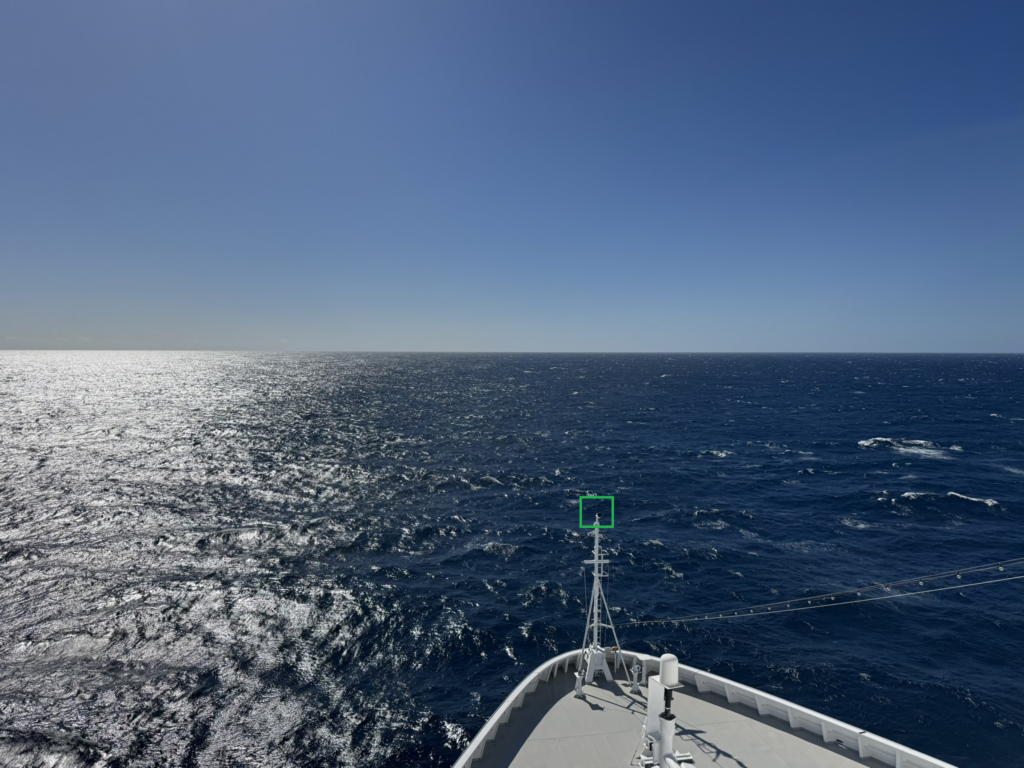 Atop the front mast is a small black electronic sensor, as marked in the green box.