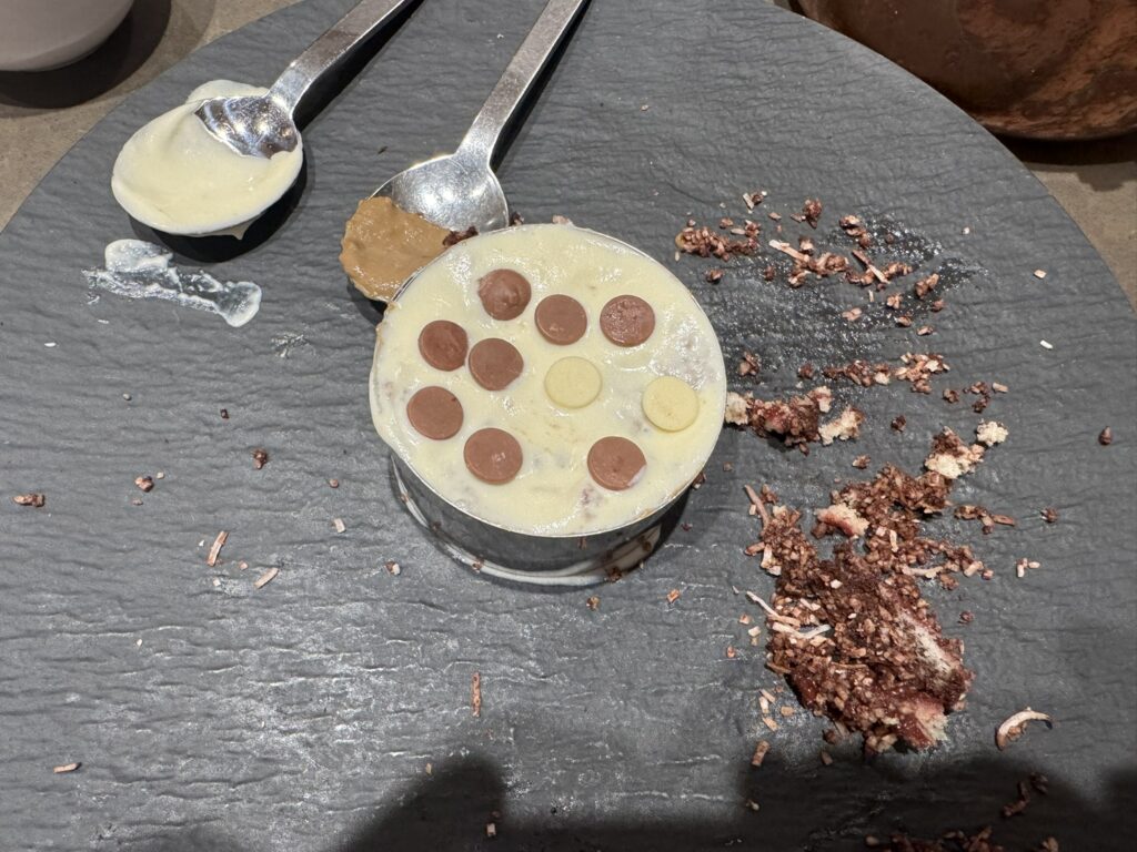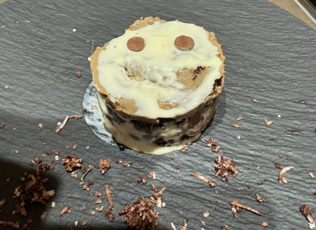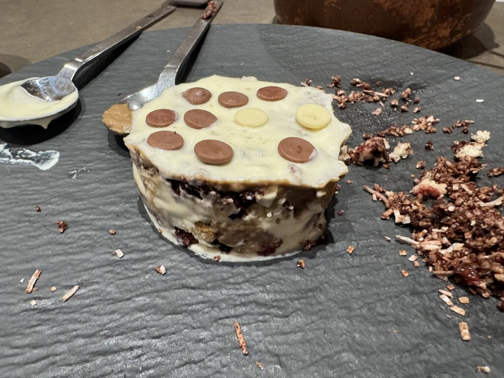The kids order the lava cake for dessert, which is back to the circular design. I have the tiramisu, which is more like a mousse in a jar with powdered coffee. It sticks in your mouth, but it doesn’t quite stick the landing.