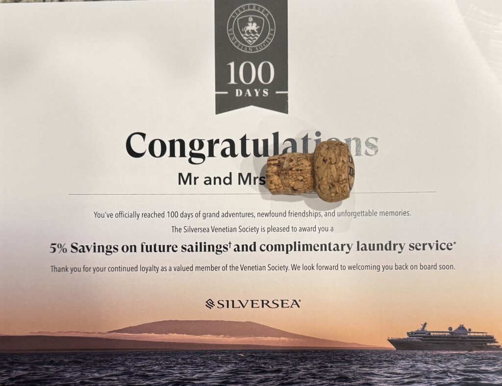 As 100 Day Venetian Society members, we will also be eligible for 5% off future cruises – which can be combined with 5% off for Venetian Society cruises and 5% off for onboard booking discounts for up to 15% off list price