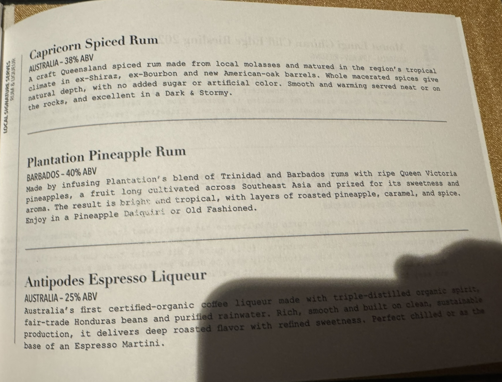I bring back a few more drinks from SALT Bar this evening, including another Technicolour, and the Capricorn Australian rum – one of the specialty spirits available here: