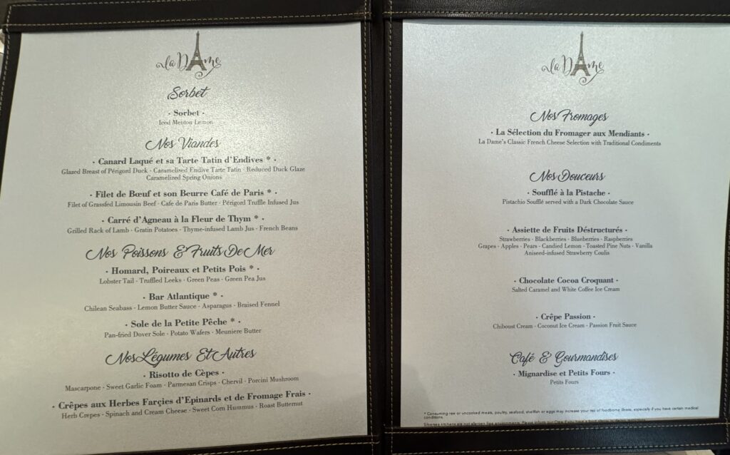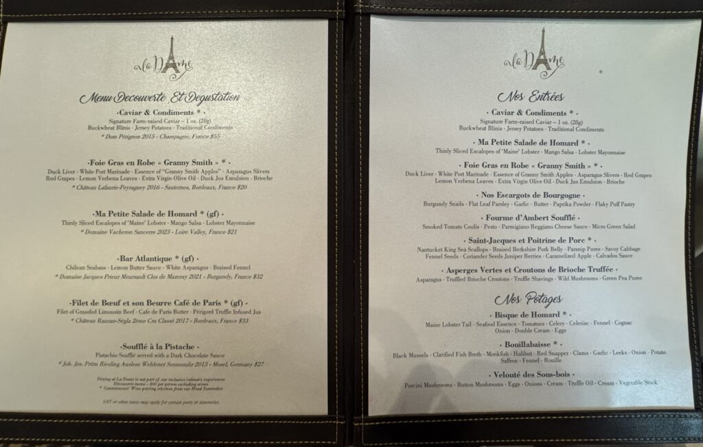 The menu is quite similar to that on the expedition ships, with the occasional addition – the escargot, bouillabaisse, and the lobster tail all seem unfamiliar.