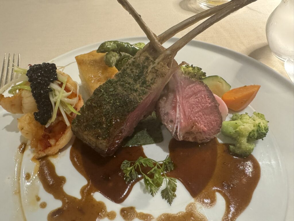 And then, for our mains, I have the rack of lamb with an extra lobster tail and truffled caviar: