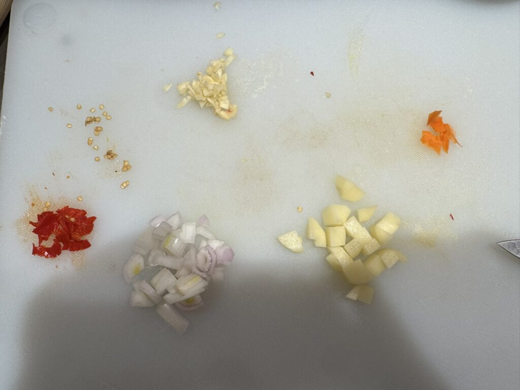 We start by cutting the vegetables into cubes.