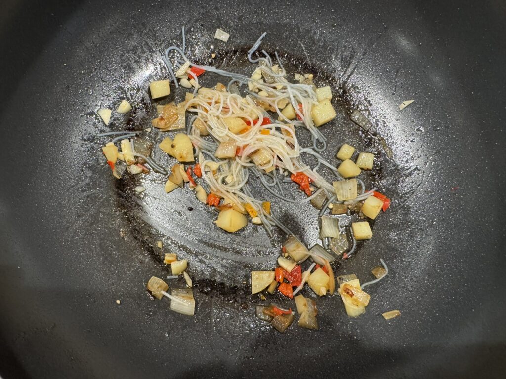 We then cook that up in the wok – along with the glass noodles – adding the garlic and peppers in near the end: