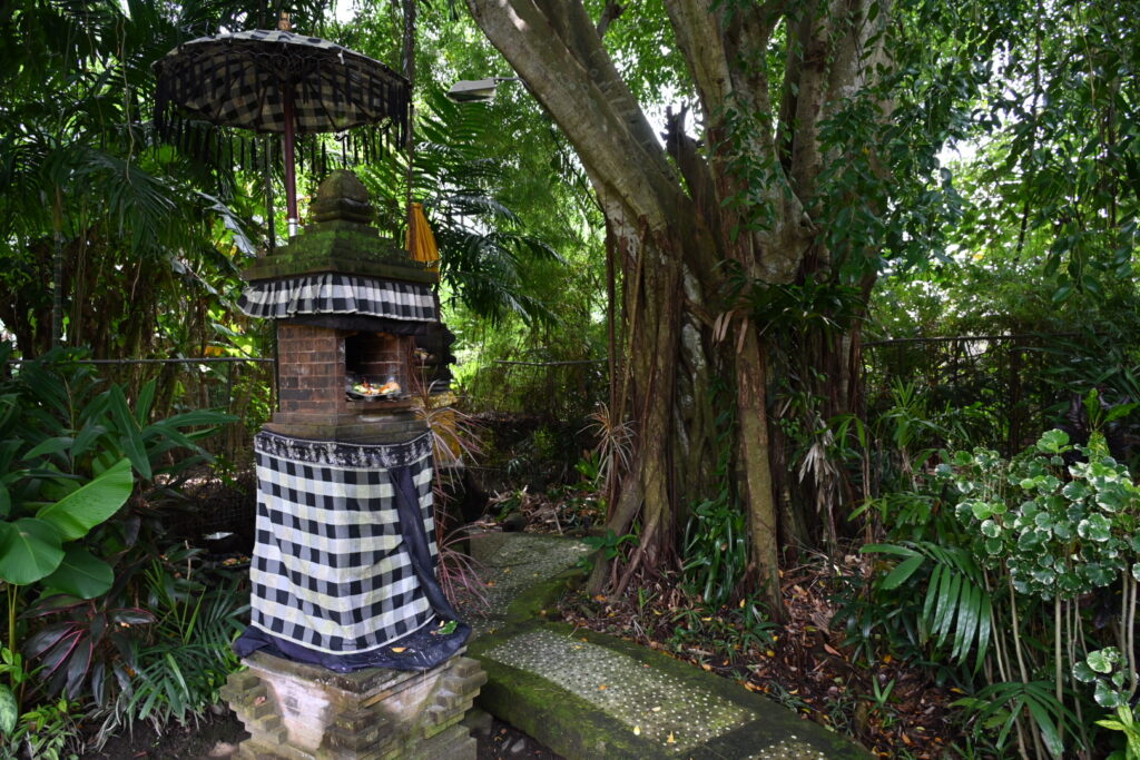 We learn that offerings are a complex affair in Bali. Different coloured offerings are made daily to different gods, and the colours correspond to compass orientation – white to east, red to south, yellow to west, and blue or green to the north. Our guide grows frangipani flowers and does a brisk business selling them for offerings. Businesses also sell young coconut leaves used to package the offerings.