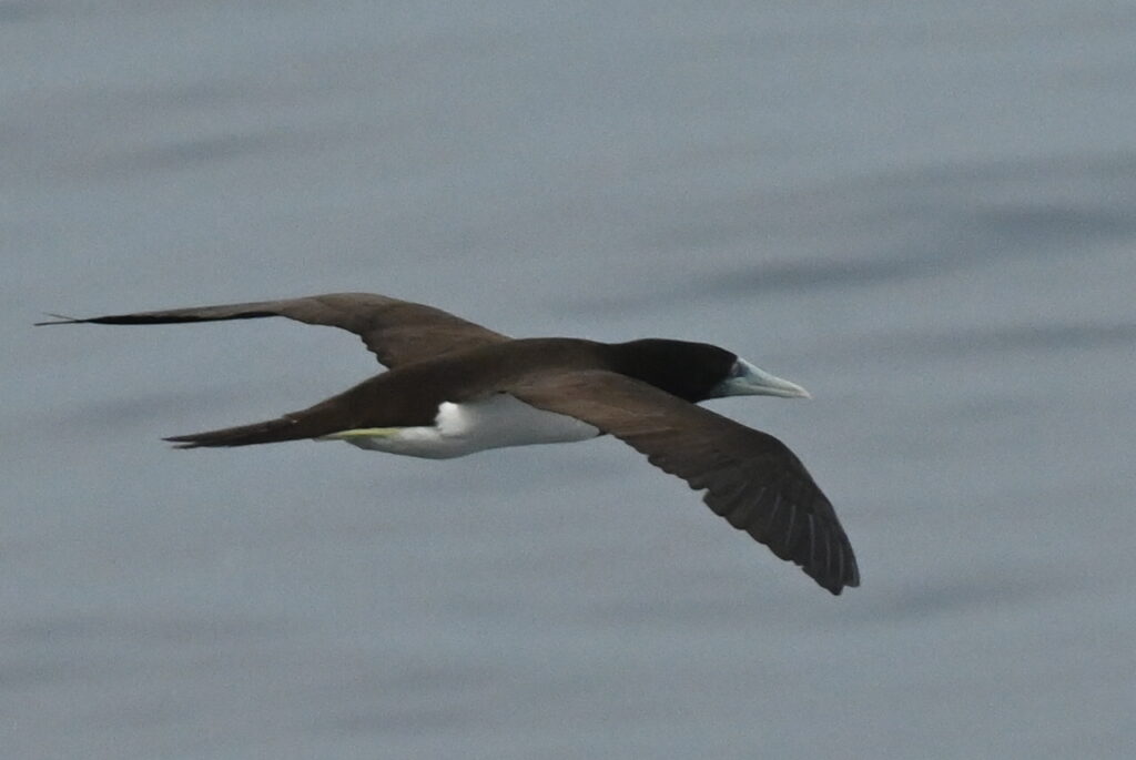 I somehow spot a brown booby in flight during our lesson: