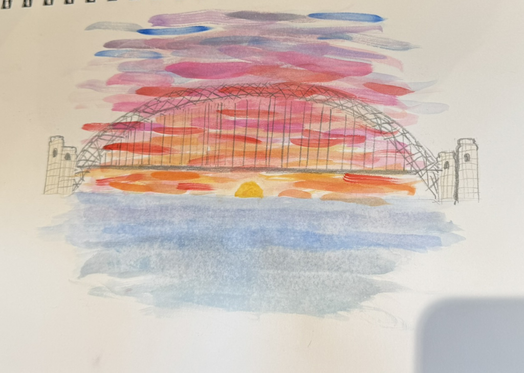 Our daughter returns to her artwork. She’s done a brilliant job with her drawing and painting of the Sydney bridge: