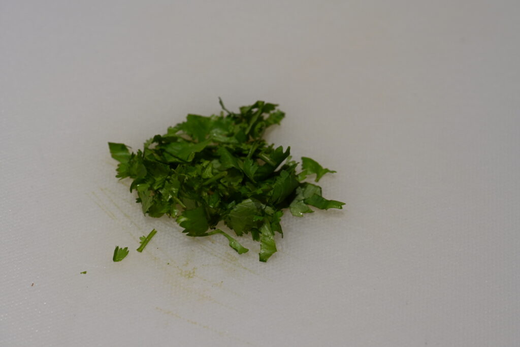 We chop the cilantro, putting half into the dish and setting half aside for the garnish.