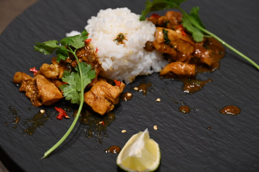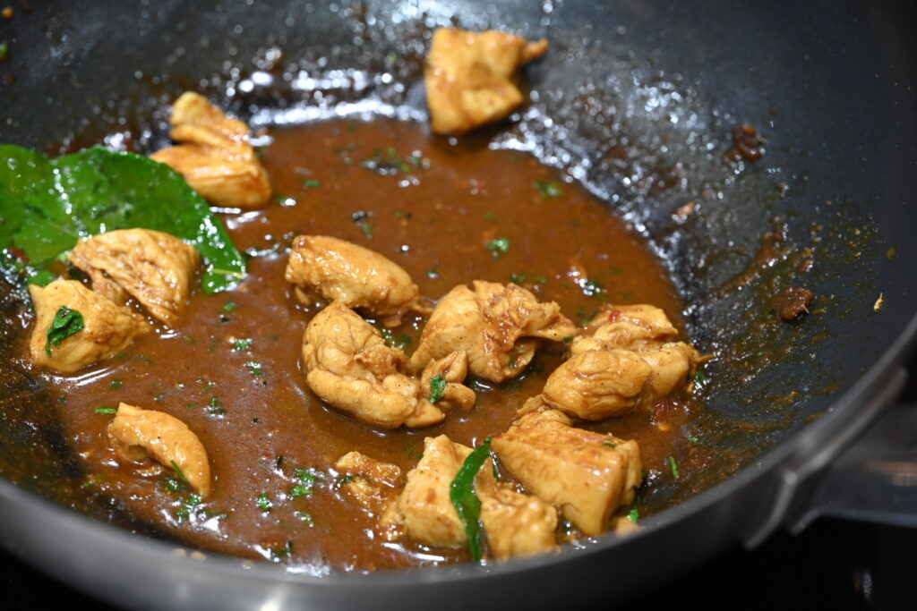 We add sunflower oil to the wok, followed by the rempah spice paste. Then we add the chicken, coconut milk and fish sauce. The lime leaves are squeezed and then added while the dish simmers – then pulled out at the end.