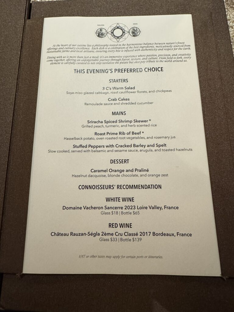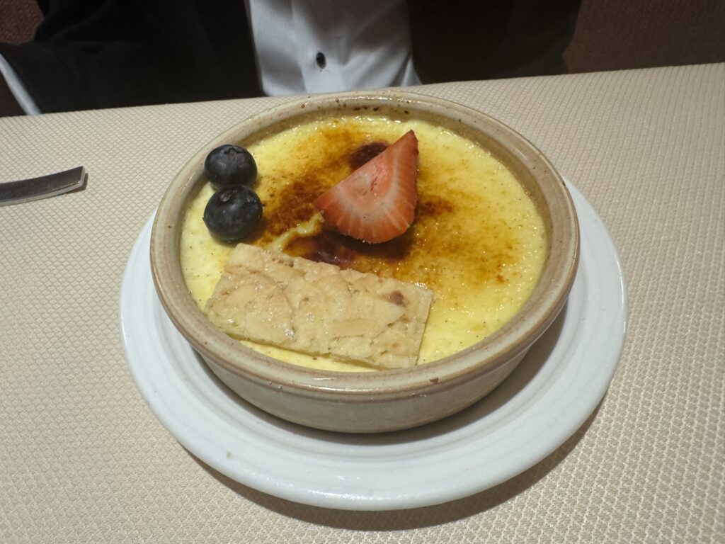 My son asks for a creme brulee for dessert. It’s not on the Atlantide menu, but it is available via room service – they kindly accommodate him: