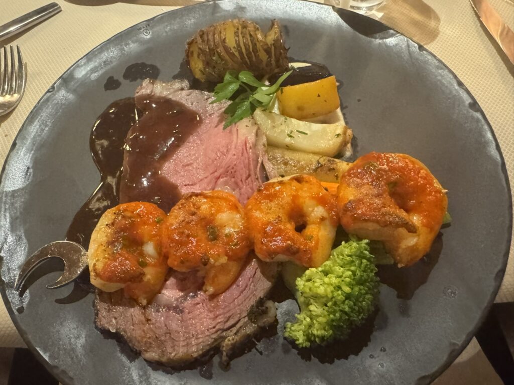 Followed by the surf and turf prime rib – with a sriracha shrimp skewer:
