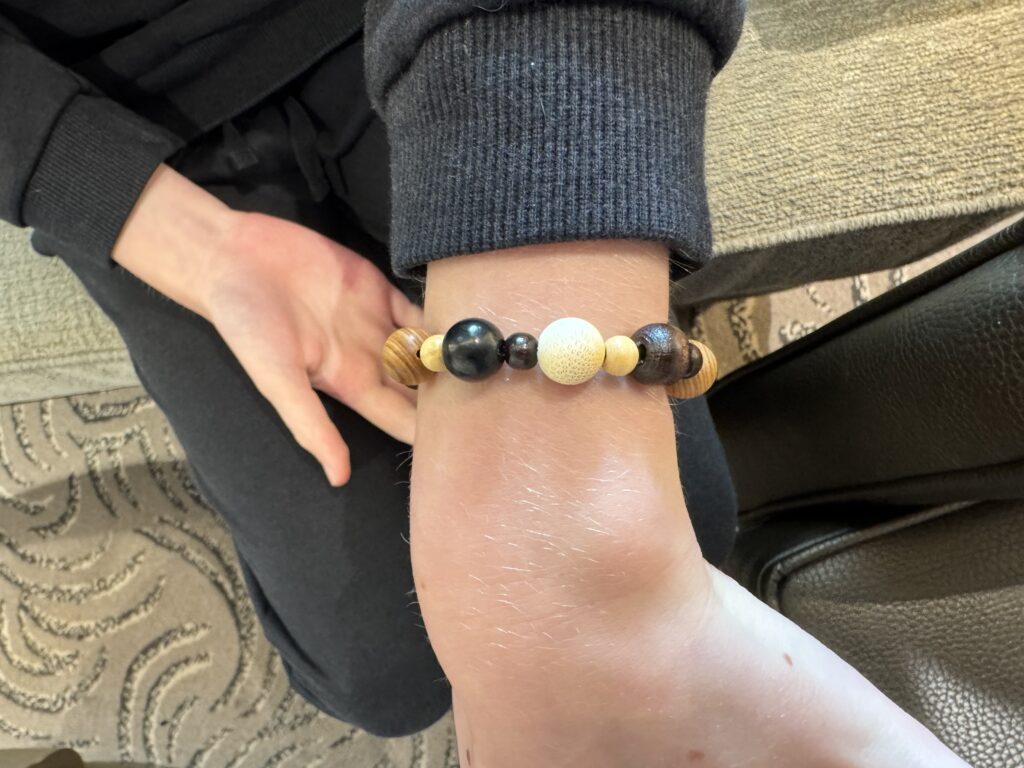 Our daughter heads to art class – they are making wooden beaded bracelets today. Hers turns out very well indeed: