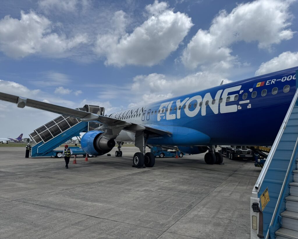 We settle ourselves on the flight to discover that we are travelling on FlyOne, a Moldovan airline running this particular charter flight. They wouldn’t be our first choice – due largely to the lack of legroom – but 1.) it’s only for an hour and 2.) at least it’s not a turboprop.