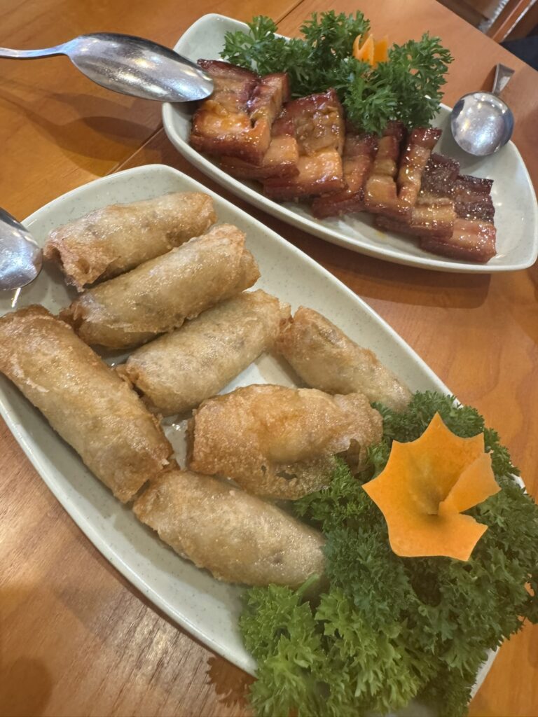 We order pork and fried springrolls: