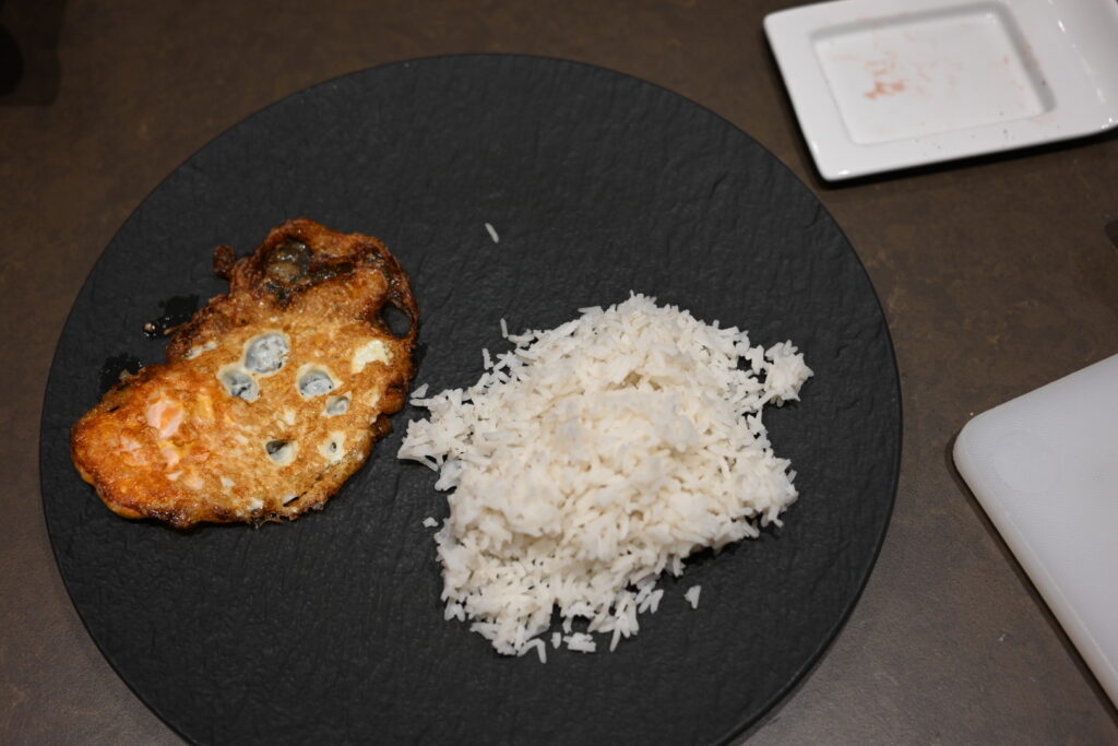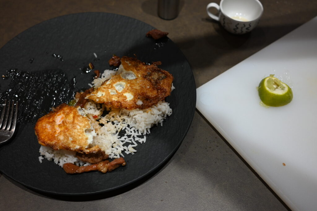 We start by frying the egg until crispy: