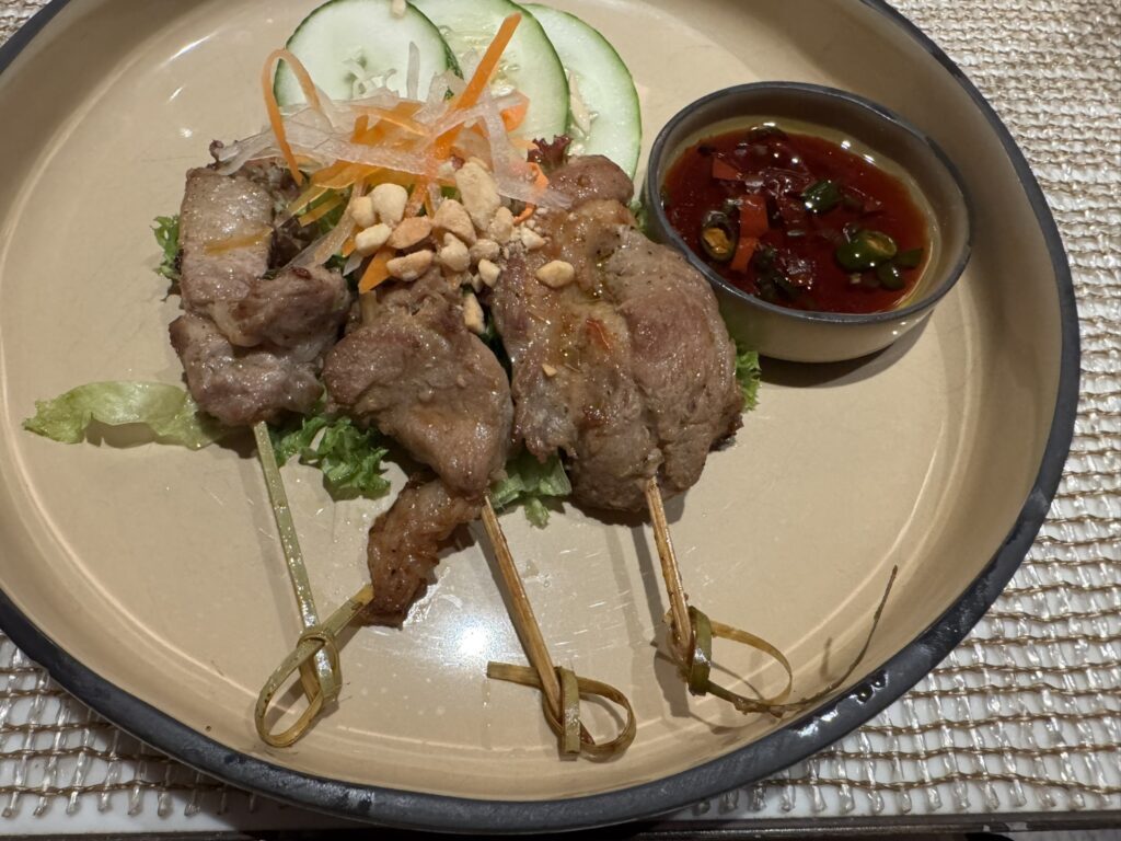 I start with the pork skewers: