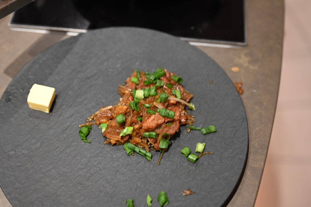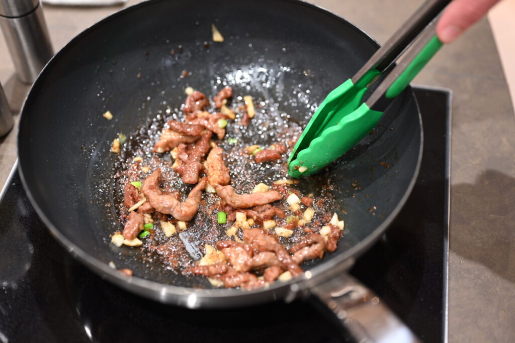 We then stir fry it with the ginger, as well as the remainder of the soy, rice wine vinegar and the oyster sauce. Later, we add the spring onions and garlic and glass noodles.