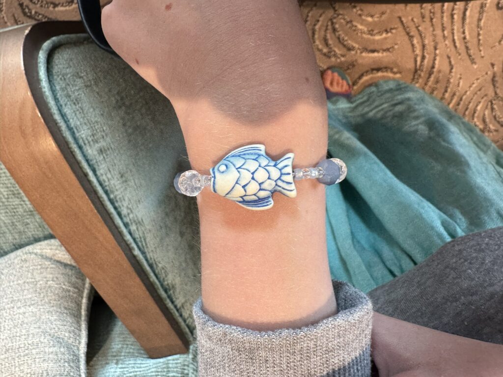 More reading / writing / homework time in the afternoon, followed by art class. Our daughter makes a beautiful bracelet:
