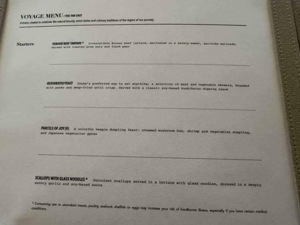 Breakfast up at Arts Cafe this morning – we are so slothful that we don’t even manage to make it to La Terrazza for 9:30 am. Instead we content ourselves with some yoghurt and perhaps a croissant or two. Though it’s not like we’re at any real risk of going hungry here. As Cruise Director Zaid says, “You are contractually obligated to eat every 45 minutes.”