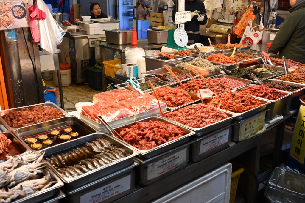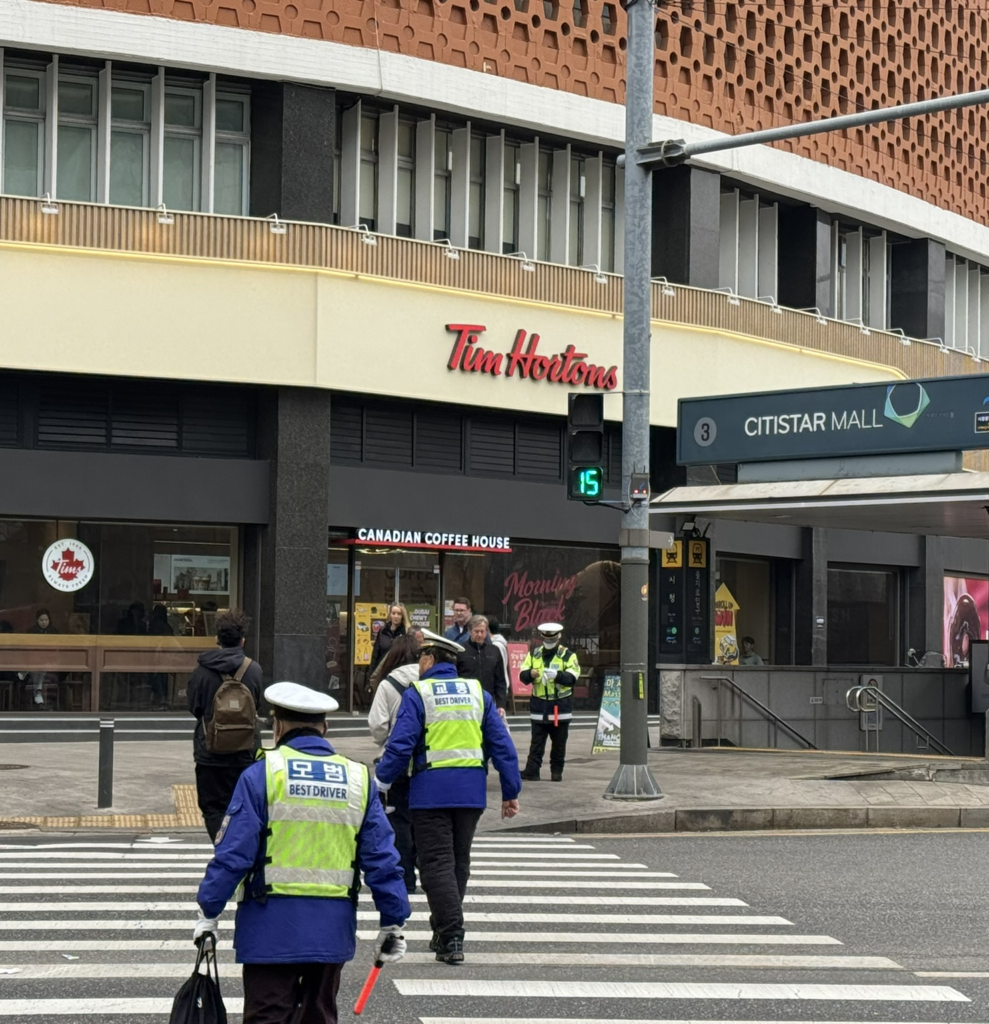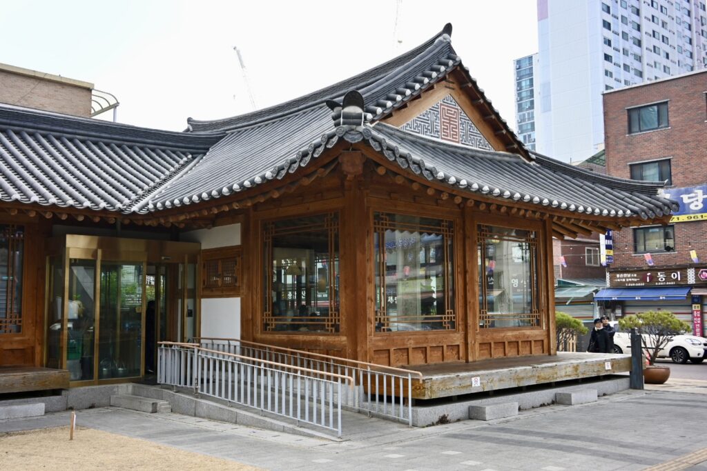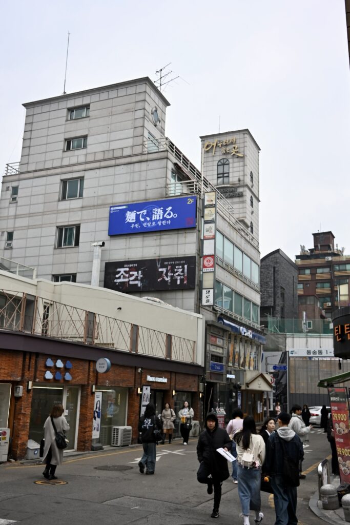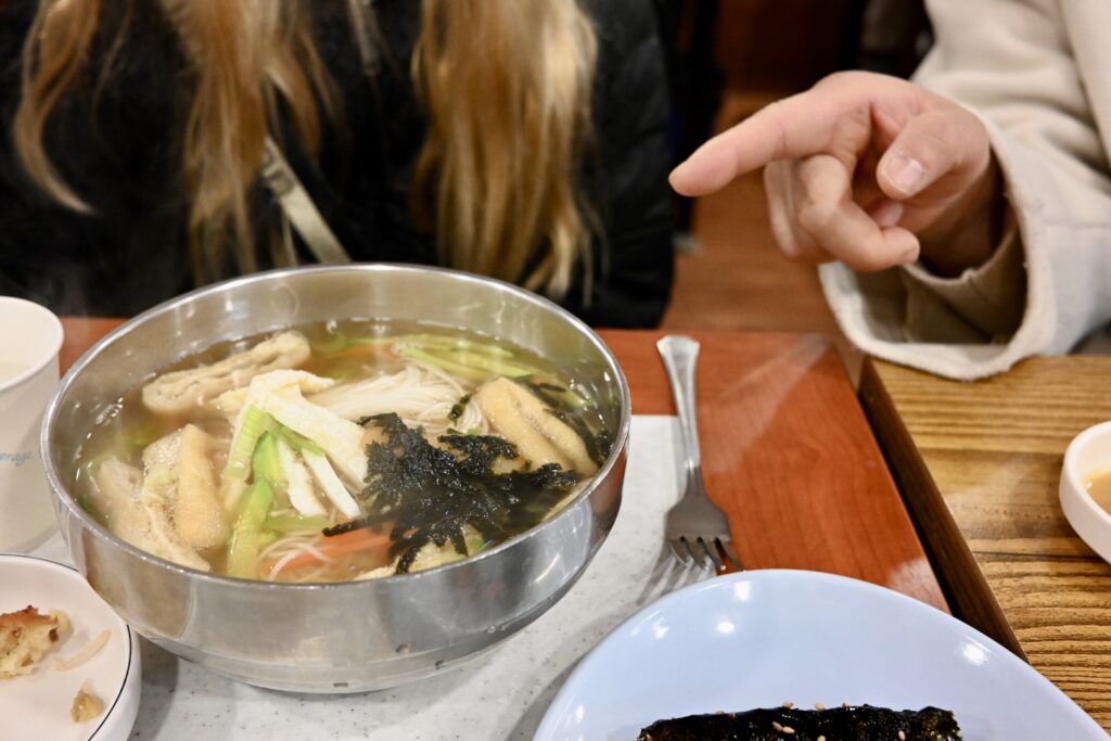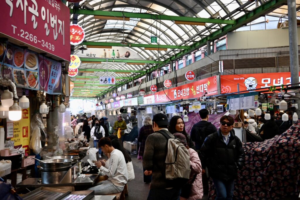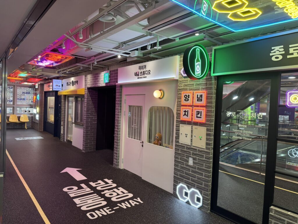 After a brief game of broken telephone, we meet Sally in the Starbucks. She kindly presents our kids with a gift of shrimp chips and rameon – both of which appeared in KPop Demon Hunters – and goes over the agenda for today. We’re going to visit the sights in a slightly different order due to marathon closure, but will visit the Bukchon Hanok Village, folowed by HiKR Ground (a K-pop Studio), Gwangjang Market for traditional Korean food, the Naksan Park Fortress Trail, and a visit to a traditional Korean wellness centre that also featured in the movie.