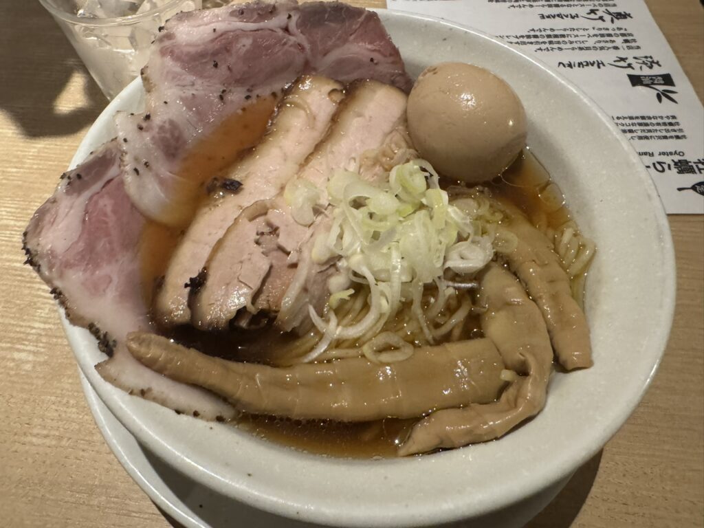 We wait for perhaps 20 minutes before we’re shown to our seats upstairs. My wife and I have the pork ramen with the works: