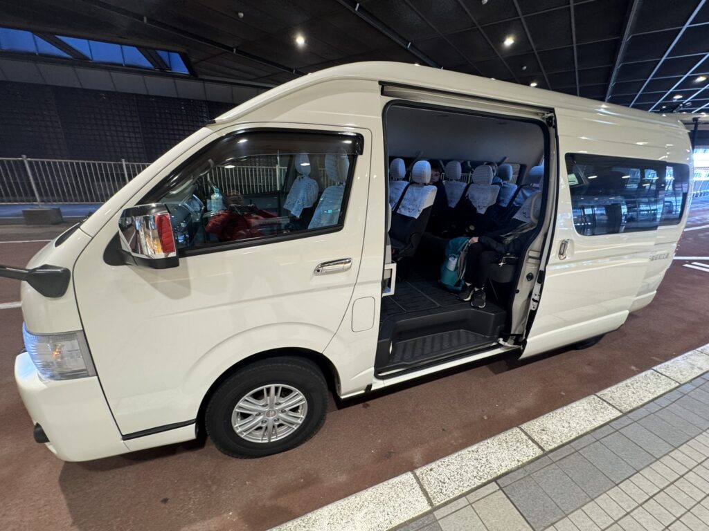 Dice arrives precisely on time in his large-but-not-massive van. Japanese mini-vans are laid out to be extra comfortable for mid-row passengers at the expense of cargo room. No matter – we are able to wedge our two large suitcases in front of the captain chairs.